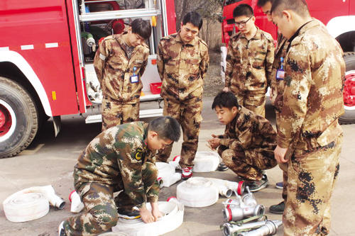 3月17日,河曲消防大隊(duì)派員深入樓子營(yíng)鎮(zhèn)神華、神東發(fā)電廠,指導(dǎo)企業(yè)消防隊(duì)員進(jìn)行消防訓(xùn)練。圖為河曲消防大隊(duì)消防員為企業(yè)消防隊(duì)員做消防操作演示。(樊彥勛 攝)
