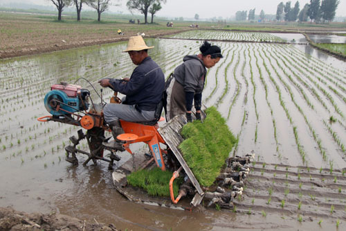 5 月31 日,原平市東營村的稻田里機(jī)聲隆隆,一派繁忙景象,農(nóng)機(jī)員正駕駛著鐵牛在插秧。這是該村頭一回用上了現(xiàn)代化的插秧機(jī)種植水稻。村民們高興地說:“如今惠農(nóng)政策就是好,現(xiàn)代農(nóng)機(jī)化作業(yè)為俺農(nóng)民種田致富插上了金翅膀?!保ㄚw春曉 攝)