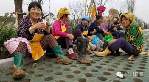 《綠化娘子軍的早餐》,在忻州一中北校區(qū),戰(zhàn)斗了一個早晨,搶時間、搶速度進(jìn)行植樹的康培綠化公司的娘子軍在吃早飯,補充體力。(黃濤 攝)