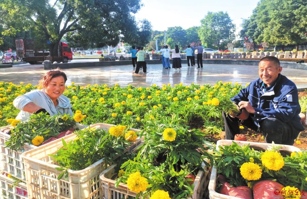 9月9日,山西云中園林工程有限公司人員在忻州城區(qū)日月廣場(chǎng)更換萬(wàn)壽菊,讓“日月同輝”主題花壇為城區(qū)添彩,喜迎國(guó)慶。 (本報(bào)記者 宮清華攝)