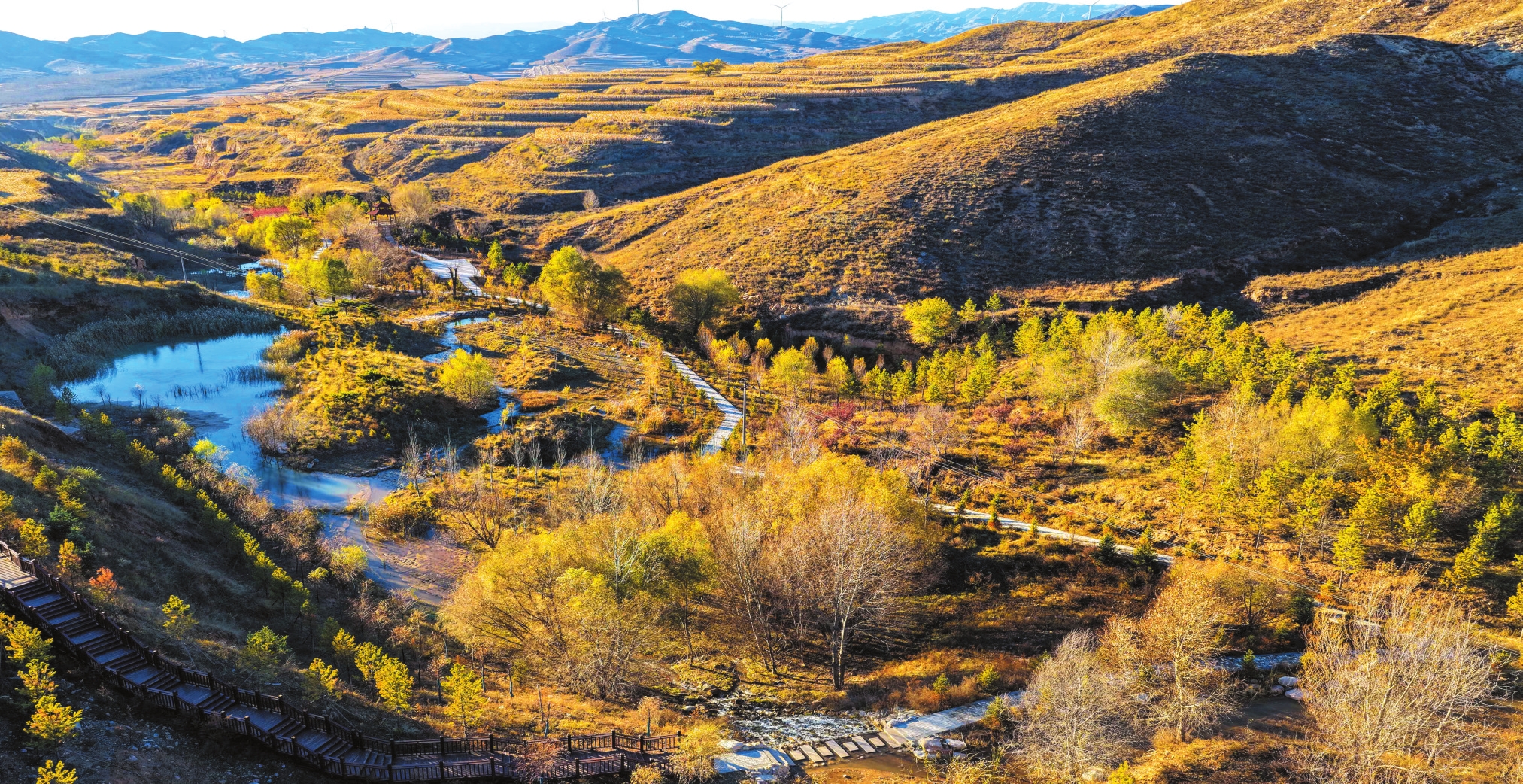 深秋時節(jié),滹沱河源頭層林盡染,碧水蜿蜒,在山川丘陵間勾勒出一幅靜謐而絢爛的生態(tài)畫卷。(