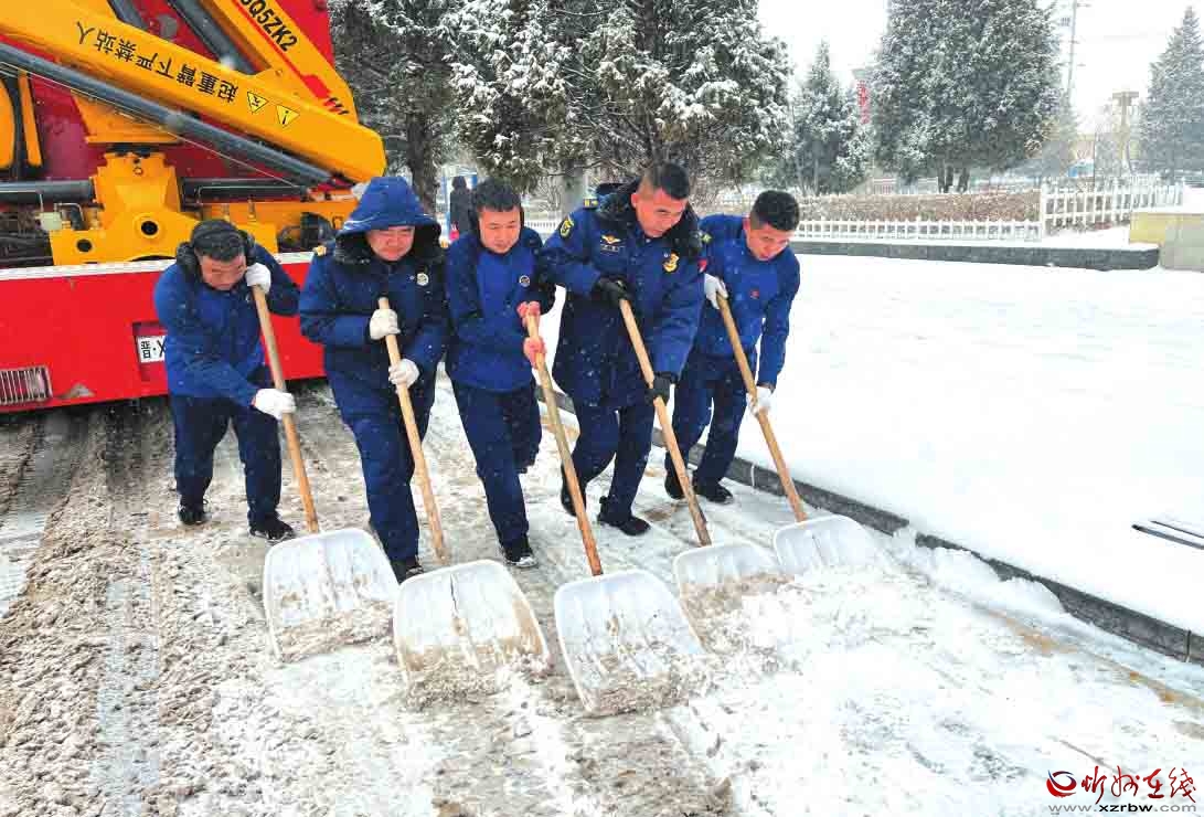五寨縣新建南路至健康街路段,消防人員在掃雪除冰。 李 娟攝圖