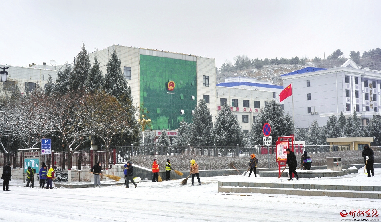 偏關(guān)縣機(jī)關(guān)干部、黨員及廣大志愿者走上街頭巷尾掃雪除冰。 陳鑫龍攝