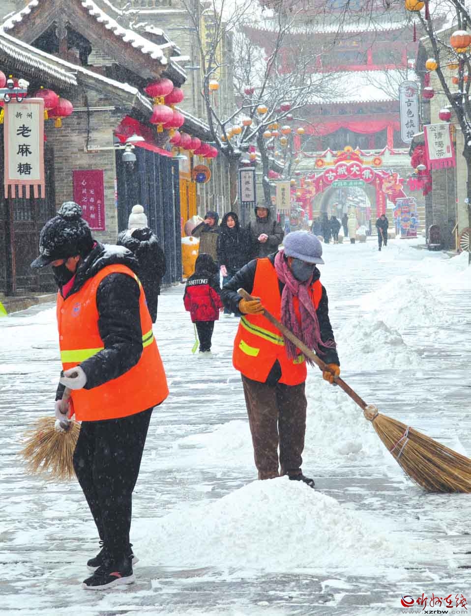 忻州古城環(huán)衛(wèi)工人與沿街商戶揮鍬掄帚掃雪。 本報(bào)記者 魏鵬飛攝圖