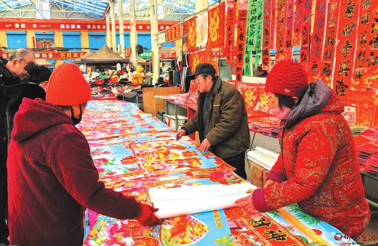 春節(jié)臨近,神池縣集貿(mào)市場迎來購銷兩旺的高峰期,處處洋溢著喜慶祥和的節(jié)日氛圍。圖為春聯(lián)年畫攤位前,市民正在精心挑選心儀的年貨。(鄭志東 攝)