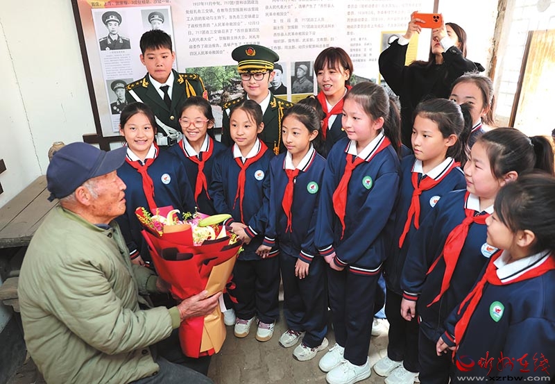 3月27日,忻州市七一路小學組織黨員、少先隊員走進忻府區(qū)官莊村原忻縣(西)第一個紅色黨支部官莊黨支部舊址,開展“傳承紅色薪火,爭做新時代好隊員”主題活動,追憶崢嶸歲月,感悟革命精神。圖為老兵武三毛給孩子們講述抗戰(zhàn)故事。(記者 張存良攝)