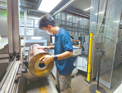 在運城制版集團(tuán)的生產(chǎn)車間內(nèi),工作人員正在檢查鍍銅后的版輥。本報記者周明飛攝