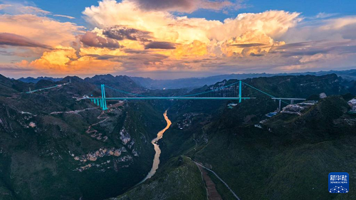 花江峽谷大橋是貴州六枝至安龍高速公路的控制性工程,大橋全長2890米,主跨1420米,是目前世界山區(qū)峽谷第一大跨度鋼桁梁懸索橋;其橋面距水面垂直高度625米,超越北盤江第一橋成為新的世界第一高橋,被譽(yù)為“橫豎都是第一”。在不同時段的光線下,世界第一高橋呈現(xiàn)出不同的美景。