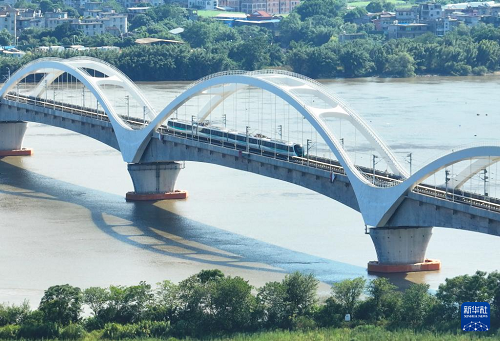 9月29日,列車駛?cè)霝I??炀€帝封江站(無人機照片)。(新華社記者 林善傳 攝)