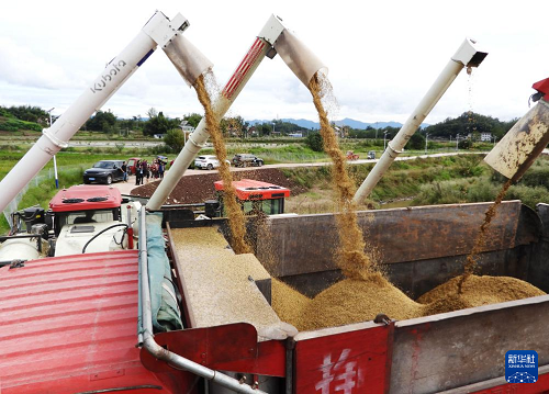 10月22日,在四川省達(dá)州市大竹縣石橋鋪鎮(zhèn)長(zhǎng)青村的稻田間,農(nóng)機(jī)手將收獲的水稻裝入運(yùn)糧車。(新華社發(fā) 鄧良奎 攝)