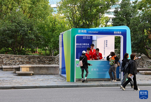 11月3日,志愿者在國家會展中心(上海)的一個(gè)咨詢處內(nèi)工作。(新華社記者 方喆 攝)
