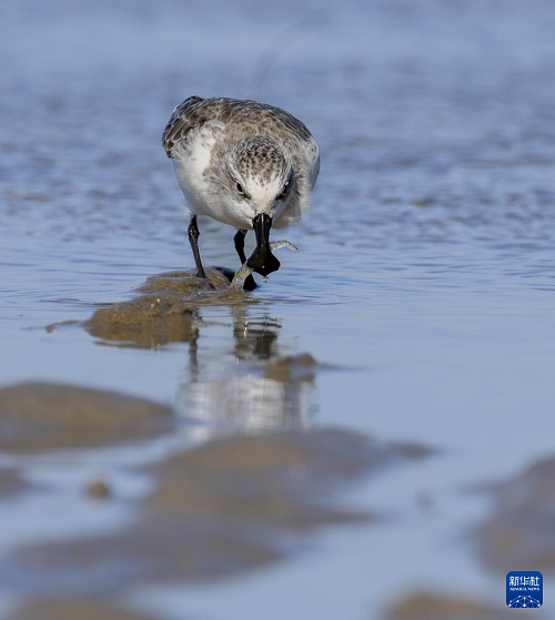 11月9日,一只勺嘴鷸在泉州圍頭灣灘涂上捕食海蝦。(新華社記者 魏培全 攝)