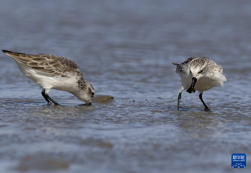 11月9日,兩只勺嘴鷸在泉州圍頭灣灘涂上覓食。(新華社記者 魏培全 攝)