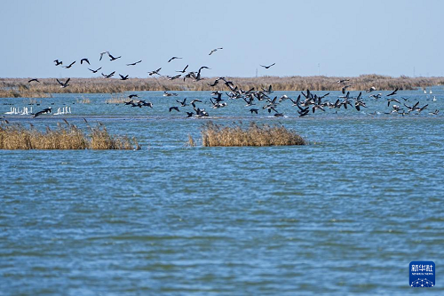 11月13日,在黃河三角洲國(guó)家級(jí)自然保護(hù)區(qū),越冬候鳥在飛翔。(新華社記者 朱崢 攝)