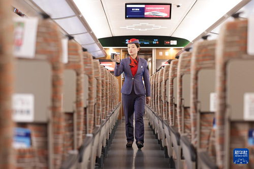 11月17日,乘務(wù)員在一列試驗動車組內(nèi)工作。(新華社發(fā) 賈智煒 攝)