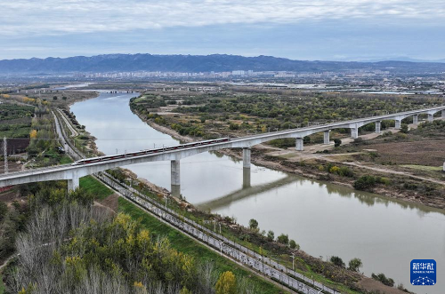 11月17日,一列試驗動車組通過西延高鐵渭河特大橋(無人機照片)。(新華社記者 張博文 攝)