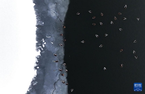 11月27日在松花江哈爾濱段拍攝的綠頭鴨寒江休憩、覓食場景(無人機照片)。(新華社發(fā) 張樹 攝)