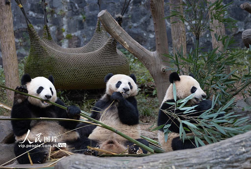 2025年12月1日,四川省都江堰市中國大熊貓保護研究中心都江堰青城山基地,大熊貓享用美食、嬉戲玩耍,憨態(tài)可掬,惹人喜愛。陳先林攝(人民圖片網(wǎng))