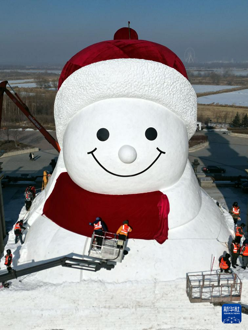 12月14日拍攝的建設中的哈爾濱市群力音樂公園網紅大雪人(無人機照片)。(新華社發(fā) 劉洋 攝)