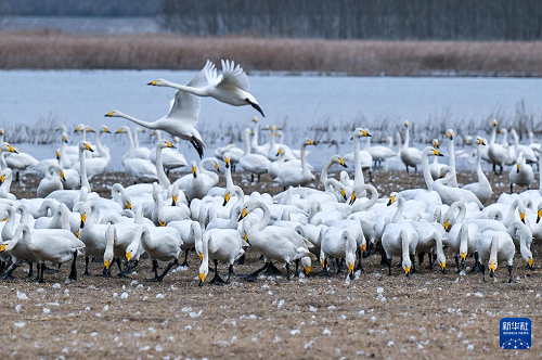 進(jìn)入冬季,大批白天鵝來到河南省三門峽市黃河濕地棲息越冬。近年來,隨著當(dāng)?shù)夭粩嗉訌婞S河沿岸濕地生態(tài)保護(hù)工作,白天鵝的數(shù)量逐年增加。目前,三門峽黃河岸邊40余萬畝淺灘濕地已迎來萬余只白天鵝。