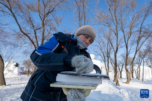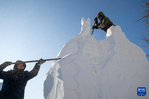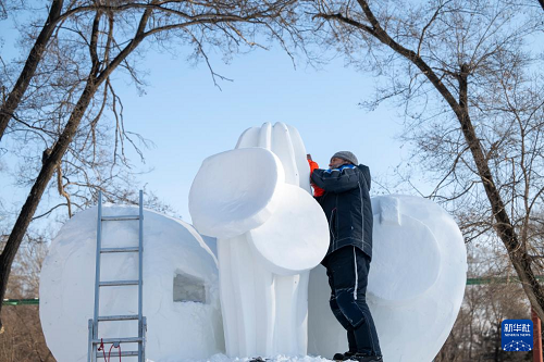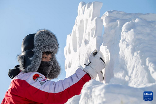 1月7日,在哈爾濱太陽島雪博會園區(qū),來自13個國家的25支代表隊百余位藝術家在寒冬中堅持藝術創(chuàng)作,精雕細琢雪雕作品。