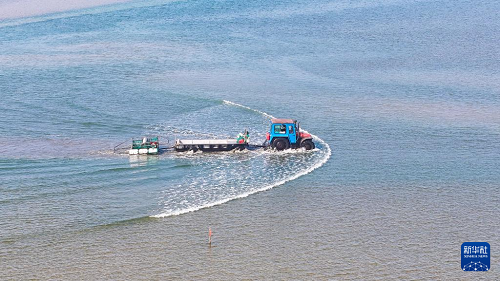 1月15日,養(yǎng)殖戶駕駛拖拉機(jī)趁著退潮出海采收紫菜(無人機(jī)照片)。(新華社發(fā) 徐書影 攝)
