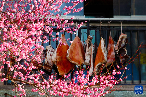 1月13日拍攝的梅花掩映著重慶市黔江區(qū)伴山國際小區(qū)居民窗口的過年臘肉。(新華社發(fā) 楊敏 攝)