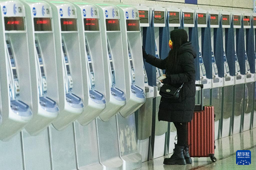 1月19日,旅客在江蘇揚(yáng)州東站售票廳內(nèi)的自動(dòng)售票機(jī)前購(gòu)買(mǎi)車(chē)票。(新華社發(fā) 孟德龍 攝)
