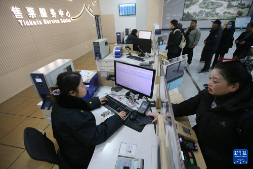 1月19日,旅客在江蘇揚(yáng)州東站售票窗口購(gòu)買(mǎi)火車(chē)票。(新華社發(fā) 孟德龍 攝)