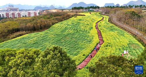 3月5日,游客在廣西來賓市忻城縣的油菜花田中游玩(無人機(jī)照片)。(新華社發(fā) 樊紹光 攝)
