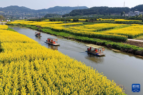 3月5日,游客在四川省南充市蓬安縣正源鎮(zhèn)石牛村乘坐游船賞花游玩(無人機(jī)照片)。(新華社發(fā) 劉永紅 攝)