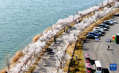 3月16日,游客在河北省石家莊市滹沱河畔賞花游玩(無人機(jī)照片)。(新華社發(fā) 陳其保 攝)