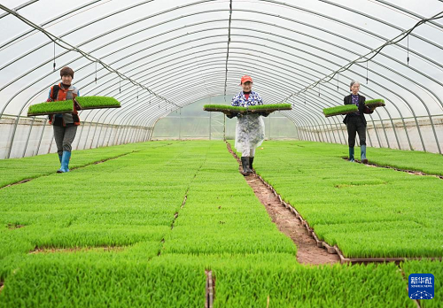 3月29日,農(nóng)民在浙江省樂清市城東街道一處集中育秧點(diǎn)轉(zhuǎn)運(yùn)水稻育秧盤。(新華社發(fā) 蔡寬元 攝)