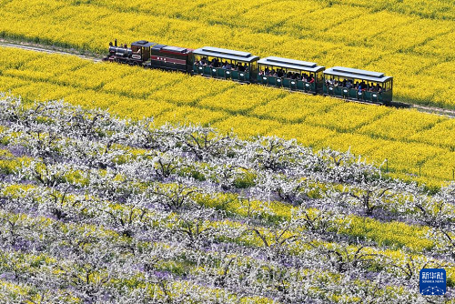 4月6日,游客乘觀光小火車從河北省晉州市周家莊鄉(xiāng)第九生產(chǎn)隊梨園旁經(jīng)過(無人機照片)。(新華社記者 楊世堯 攝)
