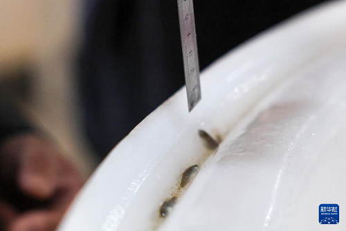 4月15日,工作人員在吉林延邊馬蘇大麻哈良種場繁育車間對魚苗進(jìn)行檢測、計(jì)數(shù)。(新華社記者 顏麟蘊(yùn) 攝)