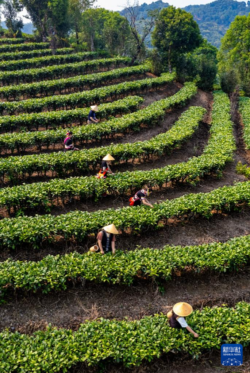 4月15日,茶農(nóng)在普洱市思茅區(qū)倚象鎮(zhèn)的茶山采摘春茶(無人機(jī)照片)。(新華社記者 陳欣波 攝)