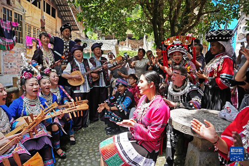 4月19日,在廣西桂林市龍勝各族自治縣龍脊鎮(zhèn)金江村黃洛瑤寨,當?shù)厝罕姾屯鈬讶藢ι礁琛#ㄐ氯A社發(fā) 韋吉陽 攝)
