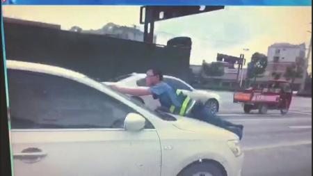 雙方僵持了半分鐘左右后,劉某竟突然加大油門將車駛出,邱峰躲避不及被頂在引擎蓋上,遂一手緊抓雨刮器,一手拍打前擋玻璃,要求劉某立刻停車,同時,車內(nèi)的乘客也叫喊著停車,但劉某依舊駕駛該車近百米才停下,下車欲將邱峰拉下引擎蓋,而此刻邱峰則堅持在其引擎蓋上與其拉扯拖延時間。