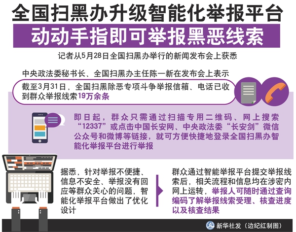 新華社北京5月28日電(記者白陽)還在擔心舉報黑惡線索不便捷、不安全、沒回應(yīng)?即日起,群眾只需通過掃描專用二維碼、網(wǎng)上搜索“12337”或點擊中國長安網(wǎng)、中央政法委“長安劍”微信公眾號和微博等鏈接,就可方便快捷地登錄全國掃黑辦智能化舉報平臺進行舉報。