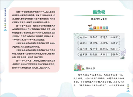 民法典涉及每個人的生老病死、衣食住行、經(jīng)濟(jì)活動等幾乎所有民事活動,被稱為“社會生活的百科全書”?!睹穹ǖ淦辗ㄈ纸?jīng)》從百姓生活入手,把百姓真正需要的法律知識通俗地表現(xiàn)出來,是民法典宣傳教育的創(chuàng)新讀物。