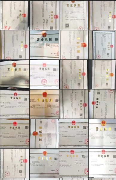 有商家向記者展示自己擁有的營業(yè)執(zhí)照,這些公司均可在招聘網(wǎng)站注冊賬號,每個售價在120元-330元。受訪者供圖
