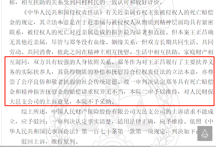 2018年一審,2019年二審,兩級法院均支持鄭冬的訴訟請求,保險公司共賠31萬余元。理由是:鄭冬與王正昌長期共同生活、共同勞動、共同消費,彼此之間在精神上相互撫慰、生活中相互扶助、家庭財產(chǎn)相互混同,雙方具有較強的人身依附關(guān)系。鄭冬作為對王正昌履行了主要扶養(yǎng)義務(wù)的實際扶養(yǎng)人,應(yīng)當(dāng)獲得物質(zhì)的補償和撫慰,其行為亦尊崇了公序良俗和敬老扶弱的社會傳統(tǒng)道德。