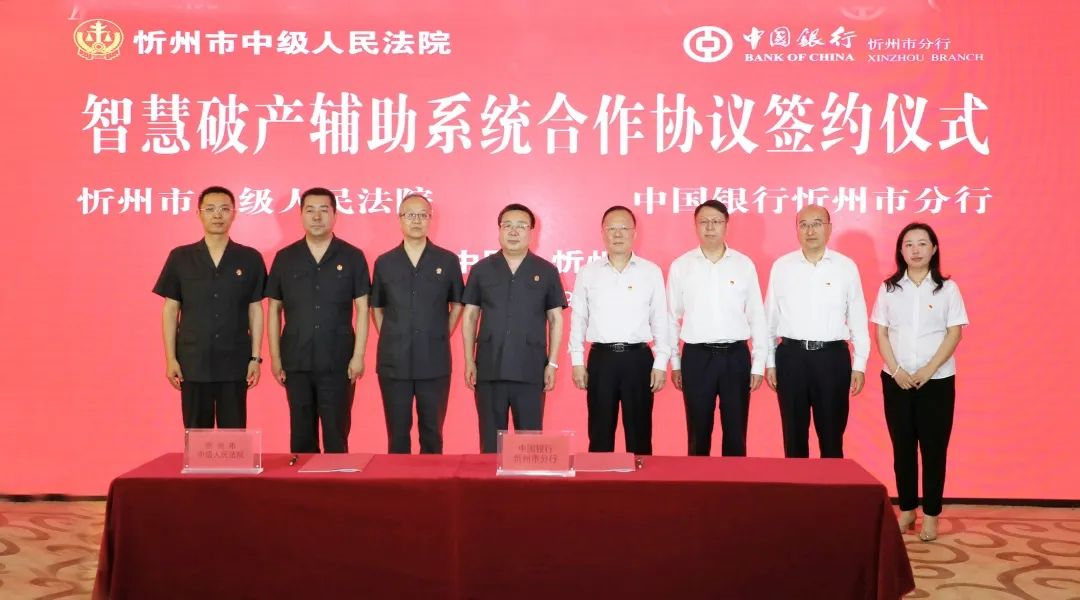 為扎實(shí)開(kāi)展“我為群眾辦實(shí)事”實(shí)踐活動(dòng),助力創(chuàng)建全市“六最”營(yíng)商環(huán)境,忻州中院持續(xù)加強(qiáng)破產(chǎn)審判信息化建設(shè),與中國(guó)銀行忻州分行聯(lián)合研發(fā)了山西省首個(gè)“破產(chǎn)案件智慧輔助系統(tǒng)”,努力實(shí)現(xiàn)破產(chǎn)審判的“高效、便利、透明”作用,全面完善智慧破產(chǎn)體系建設(shè)。9月17日,忻州中院與中國(guó)銀行忻州分行舉行簽約儀式,中國(guó)銀行山西省分行黨委委員、副行長(zhǎng)馬軍保,中院黨組書(shū)記、院長(zhǎng)劉碩才,中國(guó)銀行山西省分行行政事業(yè)機(jī)構(gòu)部總經(jīng)理陳鈺,中院副院長(zhǎng)趙海生,中國(guó)銀行忻州市分行黨委委員、副行長(zhǎng)武雁淳以及中國(guó)銀行忻州市分行城區(qū)網(wǎng)點(diǎn)及部門(mén)負(fù)責(zé)人,中院相關(guān)部門(mén)負(fù)責(zé)人參加簽約儀式。中院黨組副書(shū)記、副院長(zhǎng)劉瑞光與中國(guó)銀行忻州市分行黨委書(shū)記、行長(zhǎng)閆錦平現(xiàn)場(chǎng)簽訂破產(chǎn)審判智慧輔助系統(tǒng)建設(shè)合作協(xié)議。
