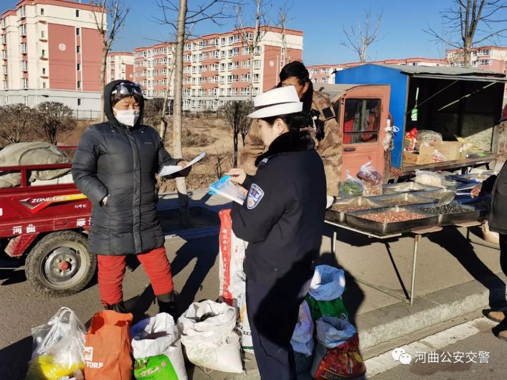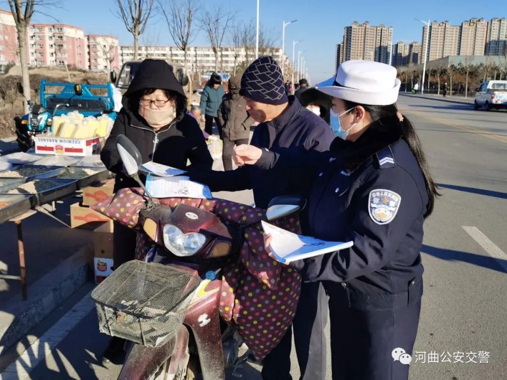 12月17日,河曲縣公安局交警大隊宣教民警走進(jìn)移民村集市,積極開展“冬季交通安全”宣傳活動。