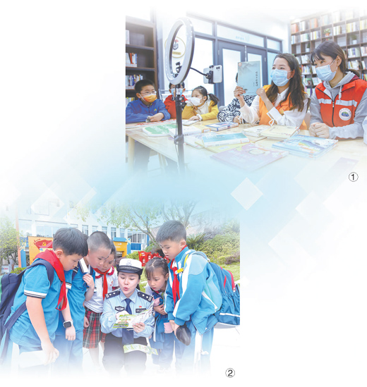 圖①:江蘇省如皋市如城街道聯(lián)合愛行動(dòng)實(shí)踐中心,走進(jìn)當(dāng)?shù)仡櫱f社區(qū)農(nóng)家書屋,通過“線上+線下”方式開展“愛閱護(hù)苗”主題公益課堂活動(dòng)。圖為志愿者通過網(wǎng)絡(luò)平臺(tái)為學(xué)生推薦好書。