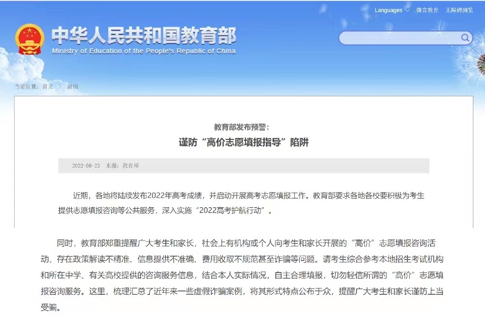 近日,教育部發(fā)布預(yù)警,提醒考生謹(jǐn)防“高價(jià)志愿填報(bào)指導(dǎo)”陷阱。有網(wǎng)站虛假宣傳擁有所謂“內(nèi)部信息”,自稱掌握內(nèi)部大數(shù)據(jù),能夠“精準(zhǔn)定位院?!钡鹊?。事實(shí)上,每年高考填報(bào)志愿前,各省級(jí)招生考試機(jī)構(gòu)都會(huì)發(fā)布當(dāng)年高考成績(jī)統(tǒng)計(jì)情況和近年來各高校錄取分?jǐn)?shù)情況,并不存在市面上的咨詢機(jī)構(gòu)或個(gè)人聲稱的“內(nèi)部信息”。還有一些咨詢機(jī)構(gòu)假冒所謂志愿填報(bào)專家身份。該咨詢機(jī)構(gòu)打出廣告,稱團(tuán)隊(duì)的專家“獲得高考志愿規(guī)劃師認(rèn)證”“來自著名高?!钡?。事實(shí)上,有關(guān)部門從未發(fā)放過“高考志愿規(guī)劃師”這類職業(yè)資格證書。該機(jī)構(gòu)一些所謂“志愿規(guī)劃師”都是臨時(shí)招募的社會(huì)人員,按照總部提供的“臺(tái)詞”給考生和家長(zhǎng)輔導(dǎo)。家長(zhǎng)購買這些機(jī)構(gòu)的服務(wù)不僅花了冤枉錢,而且可能報(bào)錯(cuò)志愿。