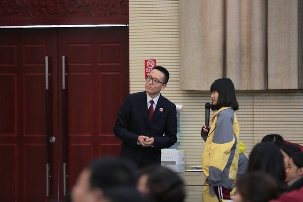 2016年11月21日,“法治進校園”全國巡講團講師、天津市紅橋區(qū)未檢干警李小龍在陜西省西安市曲江一中,與學生互動。