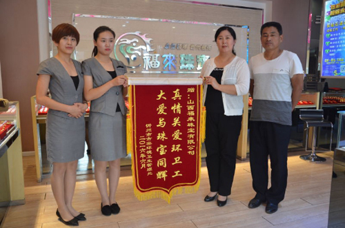 環(huán)衛(wèi)處副處長張林霞代表環(huán)衛(wèi)處向福來珠寶回贈(zèng)錦旗以示感謝