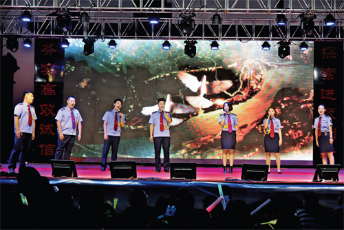 這場以“頌歌獻(xiàn)給黨,共圓中國夢”為主題的文藝晚會,是保安押運人精心組織,自編、自導(dǎo)、自演的一臺節(jié)目,就像該公司黨委書記陳志平所說:“這場文藝晚會是我們保安押運人向黨95歲華誕獻(xiàn)上的頌歌。”6月29日第一場晚會于晚8時正式上演,晚上7時便有觀眾陸續(xù)來到演出現(xiàn)場。第一場晚會就讓觀眾大呼過癮,節(jié)目形式多樣,有小合唱、獨唱、配樂詩朗誦、舞蹈、雙簧、小品、服裝秀等。其中舞蹈《映山紅》、男生獨唱《紅旗飄飄》、電聲樂隊《閃閃的紅星》歌曲串燒等用不同的藝術(shù)形式表現(xiàn)了保安押運人對黨和祖國的熱愛之情,感染了現(xiàn)場的觀眾;而雙簧表演《文武雙全》將晚會現(xiàn)場氣氛推向高潮,兩位表演者夸張的表情、搞笑的扮相引得觀眾連連叫好。