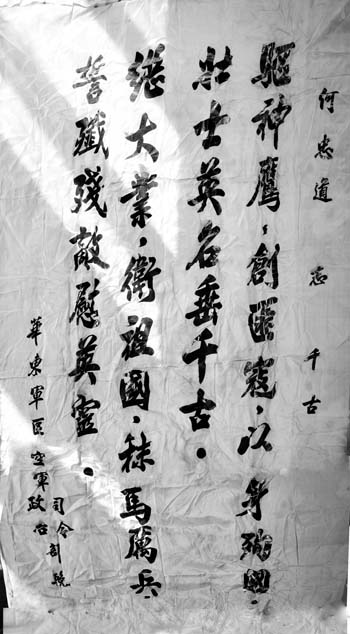 何忠道的犧牲,引起了整個(gè)空軍系統(tǒng)的震憾,人民空軍舉行了隆重的追悼大會(huì)??哲姍C(jī)關(guān)、華東軍區(qū)、生前所在部隊(duì)機(jī)關(guān)、戰(zhàn)友送了幾十幀挽幛??哲娝玖顔T劉亞樓、副司令員常乾坤、副政委吳法憲、參謀長王秉璋聯(lián)名敬獻(xiàn)的挽幛上書:“殲滅美國侵略者,堅(jiān)決保衛(wèi)祖國領(lǐng)空,為何忠道同志復(fù)仇!”華東軍區(qū)司令部、政治部敬獻(xiàn)的挽幛上書:“驅(qū)神鷹,創(chuàng)飛寇,以身殉國,壯士英名垂千古。創(chuàng)大業(yè),衛(wèi)祖國,秣馬厲兵,誓殲殘敵慰英靈。”